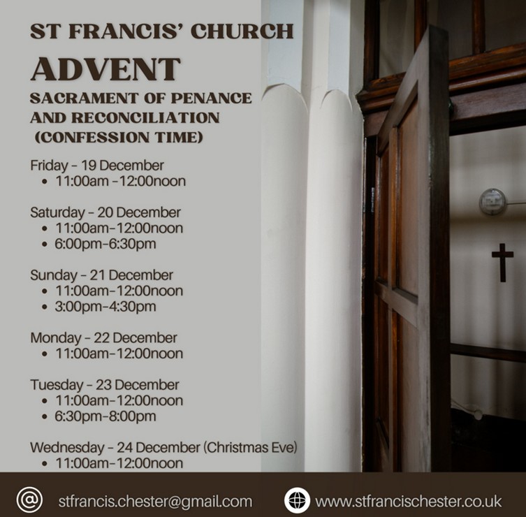As from Saturday 7th January 2023 the start time of the Saturday afternoon confession will be changing from 4:00pm to 6:00pm. Confessions will be heard starting at 6:00pm for half an hour before the 6:30pm mass. See the table below: