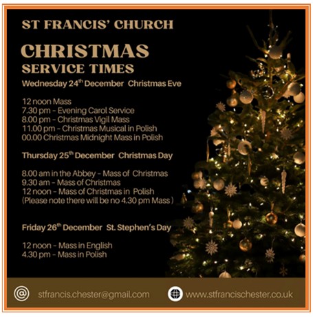 Everyone is invited to our English Carol Service on Christmas Eve at 7:30pm, followed by the English Night Mass of Christmas at 8:00pm and our Polish Carol Service on Christmas Eve at 11:00pm, followed by the Polish Night Mass of Christmas at 12 Midnight.